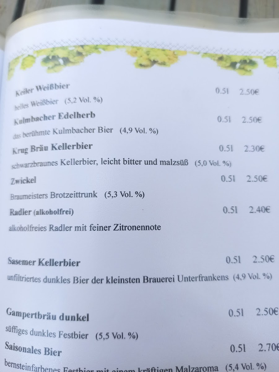The beverage offerings are typical of a cafe and gastropub, including a range of beers and house spirits, supported by the availability of traditional cakes and pastries like Kirschkuchen mit Pudding for coffee breaks or dessert.